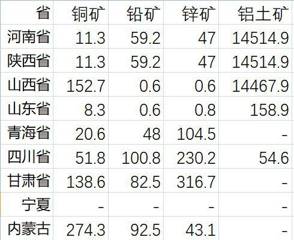 该数据集主要是流域各省份(河南省、陕西省、山西省、山东省、青海省、四川省、甘肃省、宁夏回族自治区、内蒙古自治区)铜矿、铅矿、锌矿、铝土矿的收集与整理,以万吨为单位对经典的有色金属铜矿、铅矿、锌矿、铝土矿进行了汇总。