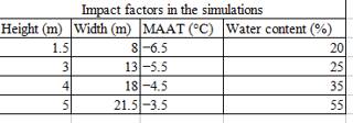 该数据集包括影响青藏工程走廊多年冻土区路堤热状态的参数,主要为路堤高度、路堤宽度、年平均气温、含水量。采用数值模拟的方式对青藏工程走廊多年冻土区路堤50年内热状况进行模拟分析,并对四种因素进行分配组合出256种情况进行参数敏感性分析。
